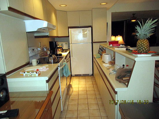 | 23:17 非日常的空間ⅱ | 23:23 非日常的空間ⅲ 大きなキッチン。冷蔵庫に入っていたゴールデンマウイ(パイナップルのブランド名)は4日目にして熟して甘いにおいが部屋に広がります。明日の朝食から食べ始めます。 |