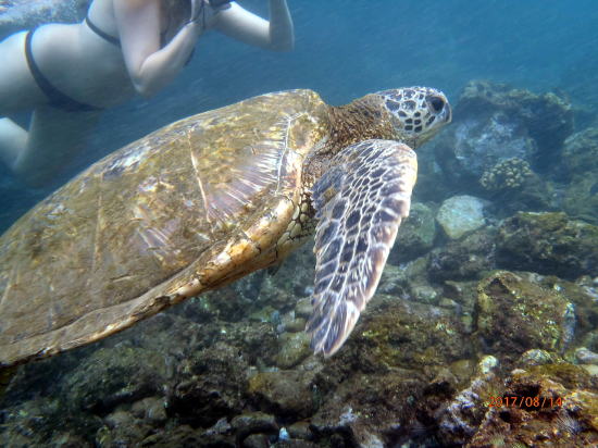 | マルアカビーチはシュノーケリングのアクティビティ船も2艘来ていました。ウミガメと一緒に美女も入っていました。 | 珊瑚に付いている藻を食べています。 |
