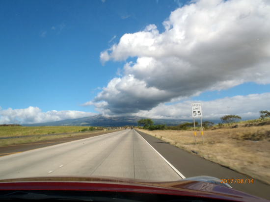 | コンド前の芝でランチです。食後風が心地良く自然に寝入ってしまします。 | キヘイからカフルイ・ピカラニへ向かう道中、貿易風が午後から吹くため南方面は雲がでます。ハレアカラ山頂付近からキヘイに続く雲の道。 |