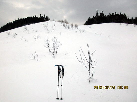 | 調子に乗りすぎて直線距離200m 下りすぎました。200m戻って小沢に入ります。 | 予定の小沢に入りました。南面でぐさぐさ雪です。 |