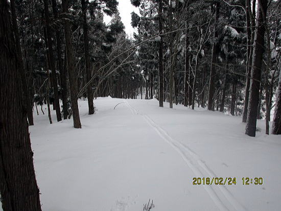| 林道に入りました。 | 林道で途中2回スキーを脱ぎました。 |