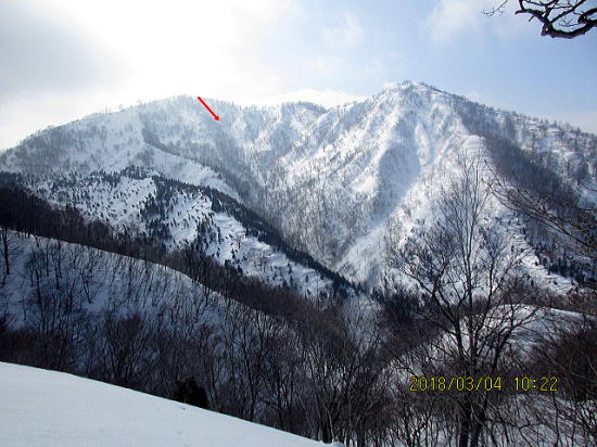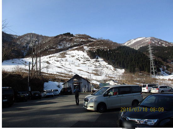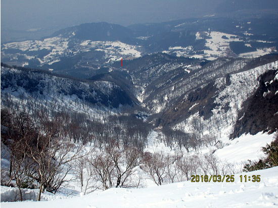 | 駐車場まで俯瞰できます。下降は正面から左の谷に入ります。 | 左の谷の名前は一のカラ谷、1月は新雪で人気があります。例年は3月は下部に雪がありません。 |