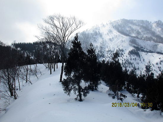 | ゲレンデトップをすぎると濃い杉の植林帯、ここは杉植林帯が終了、自然林に入ります。 | 県境尾根からは左に1385m毘沙門岳、右に1334無名峰がそびえます。赤線が滑降ラインです。 |