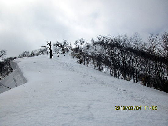 | もうちょいで山頂。ほぼ雲に覆われましたが風は少なくちょっと安心です。 | 本日の予定下降地点を偵察、雪は締まっており、それ程、樹林は密でなさそうでなく決心しました。昼食です。 |