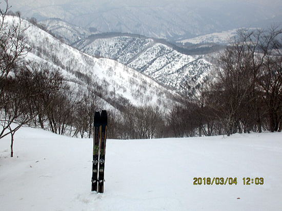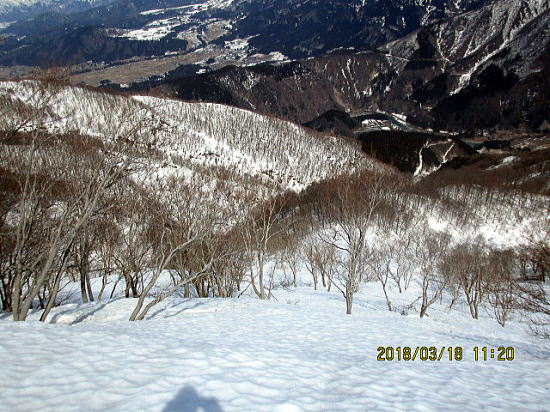| さらに山頂から見る大野盆地。 | 山頂直下の急斜面を降下。クラストしていますが、わずかに表面が融けていてラッキーです。 |