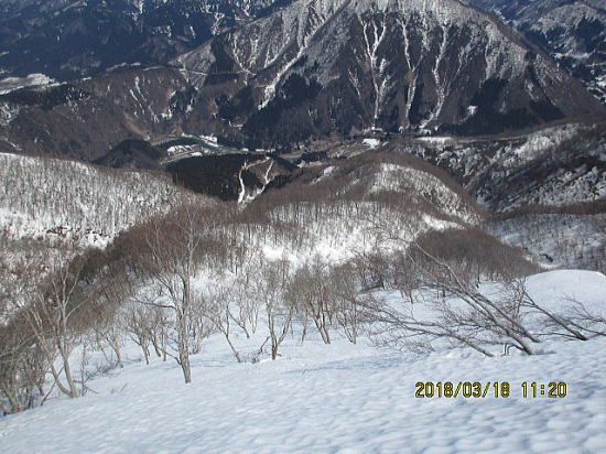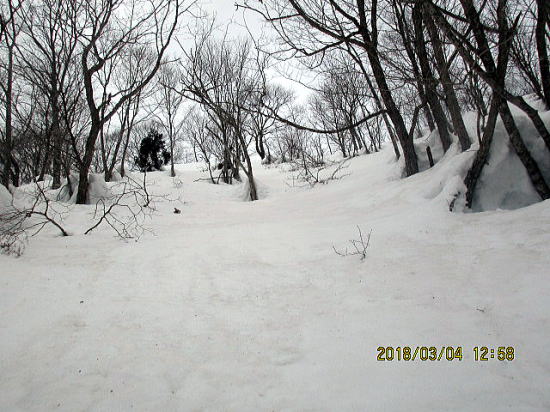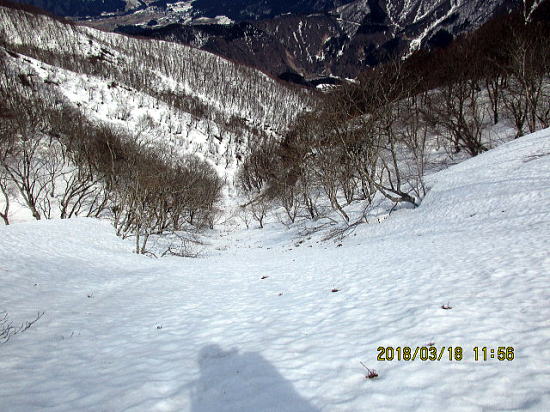 | さて滑降してみると折れ枝があるものの、まずまずの快適さですが、時々ストップスノーで気をつけて滑ります。 | ほぼきれいな斜面が同じ斜度で続きます。越前甲の北斜面を思い出しました。 |