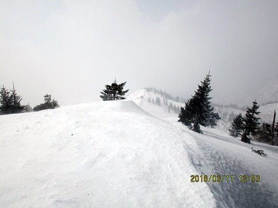 | 旧ゲレンデトップです。 | 尾根歩きですが、風が結構強い、この後11時頃から無風となります。 |