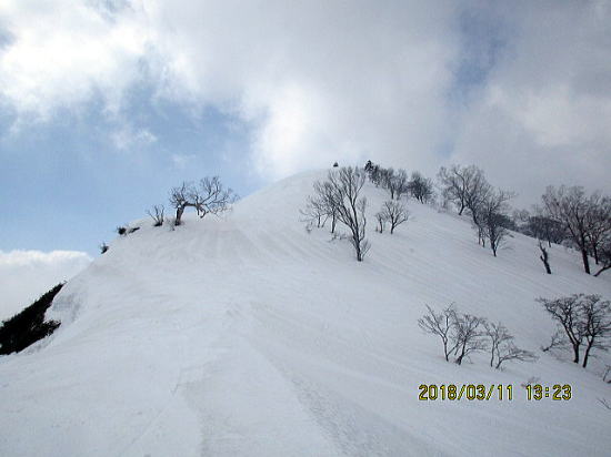 | 1180m鞍部からは狭い尾根で難儀するところですが、積雪が多いため丸っこい尾根になり登りやすい。 | いい感じ・・・歩きが3パーティー先行していました。(後でわかる) |