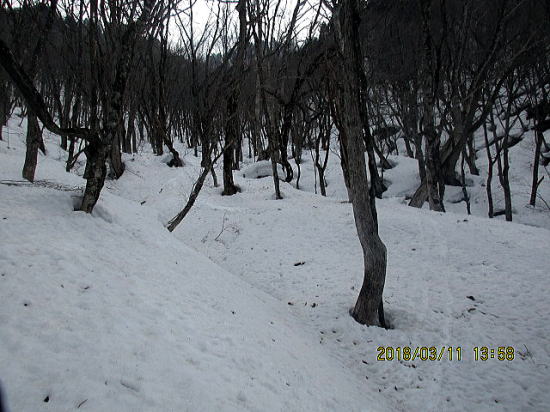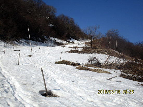 | 雪はとても多し。 | 道路から見えていた切り開きに入る。 |