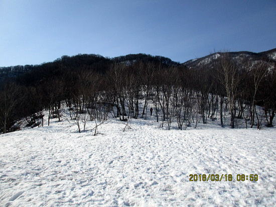 | ヤブの尾根を5分ほど下ると大きな切り開きゲレンデとなります。切り開きから上部のヤブを振り返る。 | 下方はスキー場跡でないのにこんなビックな斜面。(スキー場建設あきらめた?) |