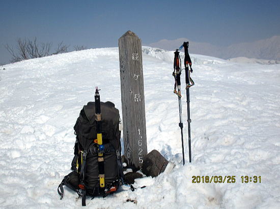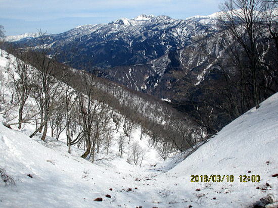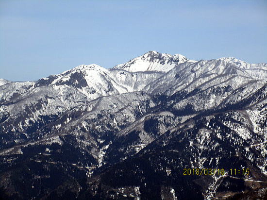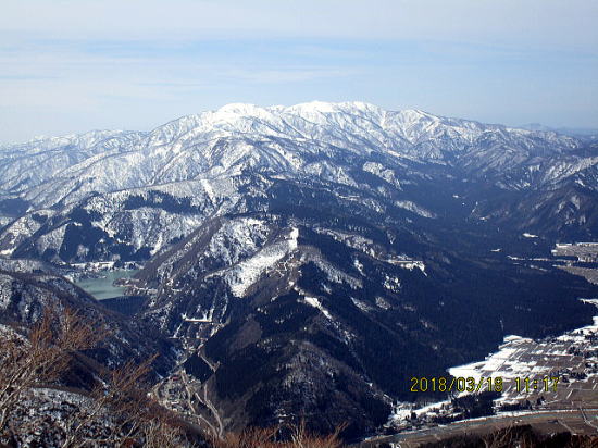 | 山頂から経ヶ岳。来週まで下部の雪はもつか。 | 毎年お世話になる銀杏峰と部子山。 |