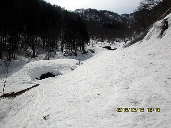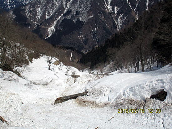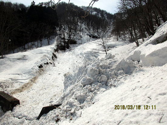 | 堰堤が見えたところで右岸に移行。林道にはまだ入りません。 | 雪崩で 自然形成U字溝になっています。 |