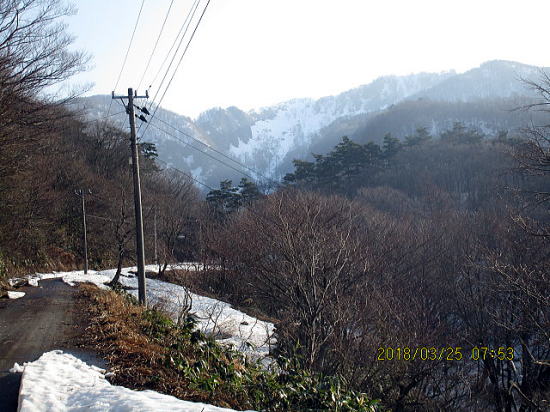 | 前々回は杓子~経ヶ岳間で転倒、肋骨を骨折した苦い経験があります。自然の家近くからの杓子岳遠望。 | 林道(自然の家作業道)終了地点、さすが雪は多い。 |