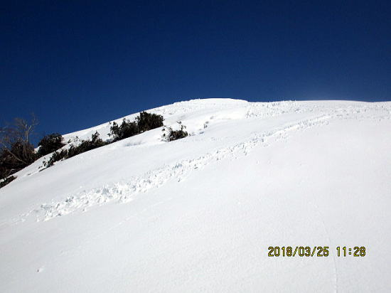 | これほど、枝が散乱していたことはこれまでありません。大雪、雪崩がが木々をなぎ倒しているのでしょう。 | 台地に乗りあげました。乗り上げの急斜面は雪不足とクラストで緊張を強いられました。 |