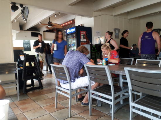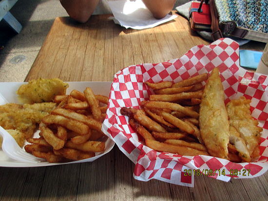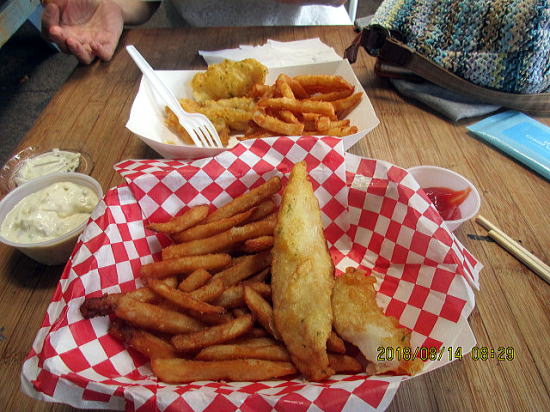 | 歩いて5分のMaui Fish N Chips 店名通りフィシュアンドチップスで有名らしい、お値打ちでランチには行列ができる。我がコンドの受付スタッフも両親と来ていた。 | フィッシュは安いのはバンガシウスやタラ(多分マックの白身はタラ)ここでは一番おいしいと薦められたマヒマヒを頼んだので19ドルしたと思う。レストランのデナーの魚はだいたいマヒマヒのようだ。 |