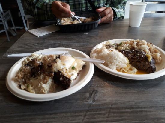 | 歩いて2分のDA KITCHEN ランチ時は行列です。 | ロコモコです。14.79ドルでシェアしてもライスは残しました。写真はわけているところ。 |