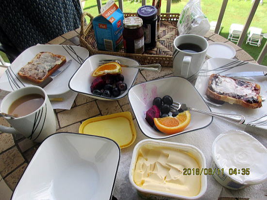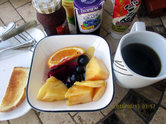 | 朝食は黒ブドウ:種なしで甘い、ドラゴンフルーツ:初トライでしたがイチジクのような味、オレンジです。ヨーグルトの代わりに濃厚なサワークリームを使いました。 | この日は車で15分のマケナ・ランデング・ポートで泳ぎました。 |