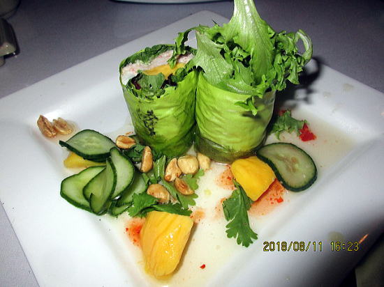| 夕食の人気店であるサンセイ寿司バーは行きは徒歩30分、帰りはタクシー10分ですが待つこと15分でもったいないかな?レインボーロールです。上はサーモン、マグロ、アボガドのトッピング、内部はカリフォルニアロールですがカニかまではなくて本物のカニで感動です。これは日本でもトップクラスの味と見映えでしょう。 | スタッフのお薦めで寿司なのですが ご飯なしでがっくり、アピタイザーですね。 カシューナッツ、マンゴー、パクチーなどとレタスで正真正銘のカニをまいてあります。軽いが味はかなりのものです。 |