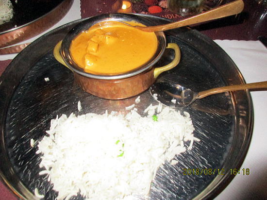 | インドカレー(マヒマヒ白身魚)をオーダーしました。大きなトレーにカレーをかけます。カレーはシェアする前、ライスはシェア後です。味は何と私の作る(バーモンド+ジャワ+熟カレー+ココナッツミルク+ヨーグルト)カレーに似ていて自分の味に自信をもちました。もちろんおいしいです。 | |