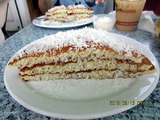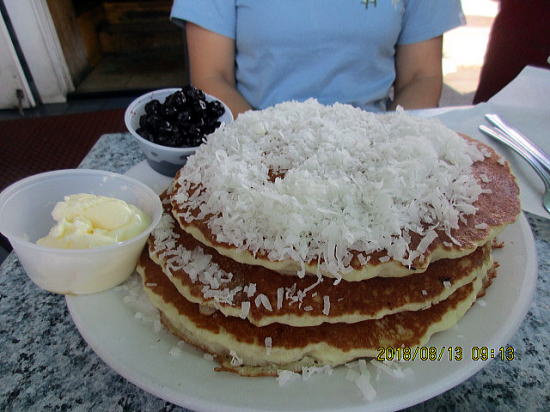 | ランチはキヘイ・カフェ 早朝5時から14時で終了です。 | パンケーキを頼んだが直径20センチが3枚、一人1枚で十分です。12ドルにココナッツとブルーベリーをトッピング各2ドル。 |