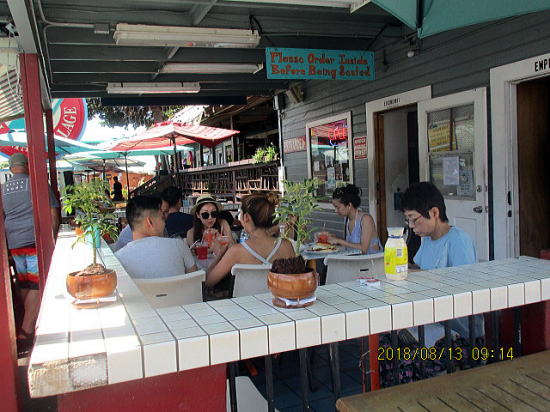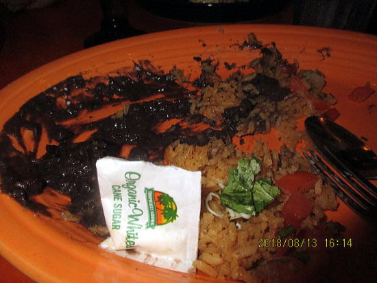 | 半分に切るとこんな感じです。多すぎて残しました。他のお客もドギーバッグで持ち帰り多いようです。(意味は犬にやるためのバッグ<パック>ですが実は人が食べている?ようです。) | 夜はFred’s Mexican Cafe お値打ちなコンボメニュー(メイン+副菜)です。タコスが3種類でマヒマヒの白身魚、チキン、牛肉です(右端)。中はレッドライスですが味つけなし。左端は黒豆(いんげんらしい)ですが味はないので、砂糖をもらい混ぜ合わせるとまさに日本のあずきあんの味でデザートにしました。22ドルくらいでしょうか。 |