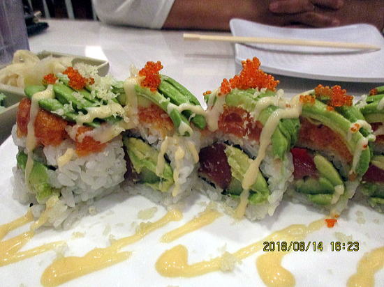 | 前回来たとき、隣席のテーブルがオーダーしていて目を奪われたのでこれに決めていました。 | とびこ、アボガド、アヒ(マグロの一種)、辛味つけマグロ、天かす、キュウリ、チリソースマヨなどでできています。 |