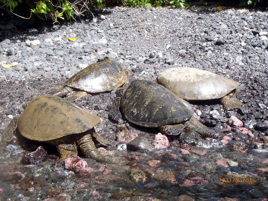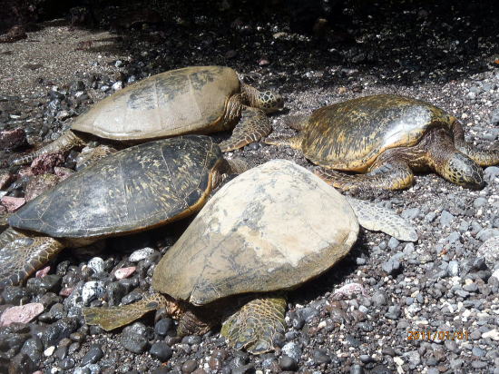 | ここはビーチ端の奥まったcove(小湾)で岩場です。ウミガメの体長は1m以上です。 | まさに甲羅干しで恍惚の表情です。 |