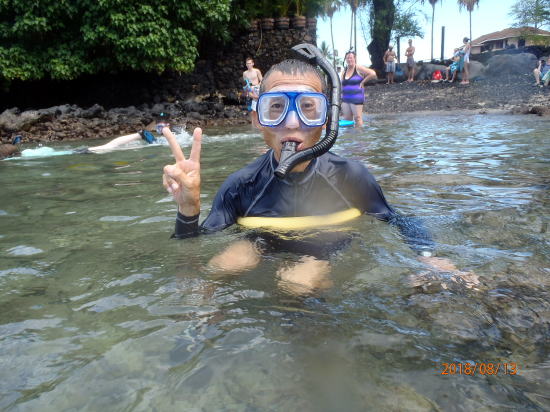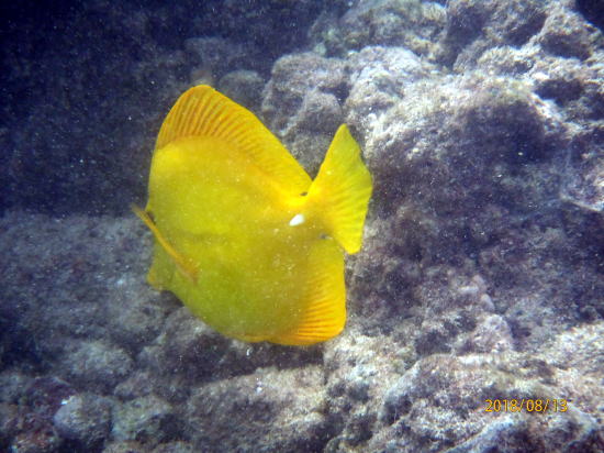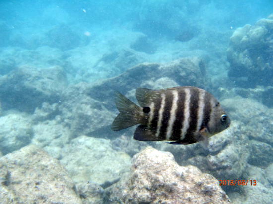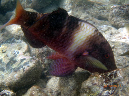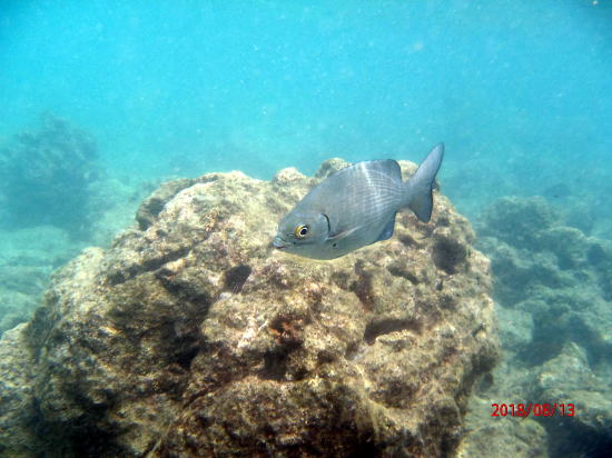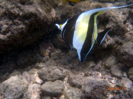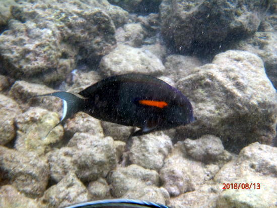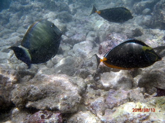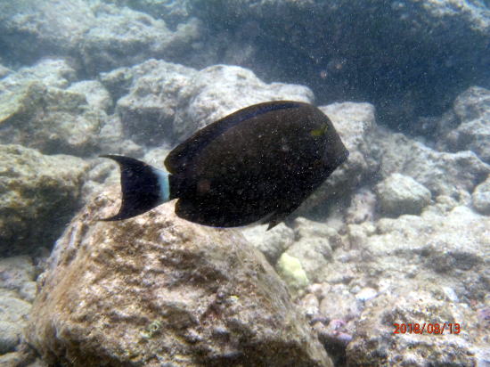 | 新しいビーチ、車で南へ30分のアヒヒビーチです。浅瀬にたくさんの魚がいます。パートナーもここなら安心と言います。私自作のライフバーを身につけています。 | 魚①、膝下以下の水深にもいます。 |