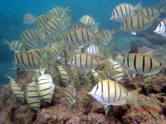 | アヒヒビーチは晴れているのは10時半まで、北からの貿易風のためハレアカラ山で雲ができて雲ができ、風が強まるのが毎日のこと。 | 魚⑥は群れる習性があります。 |