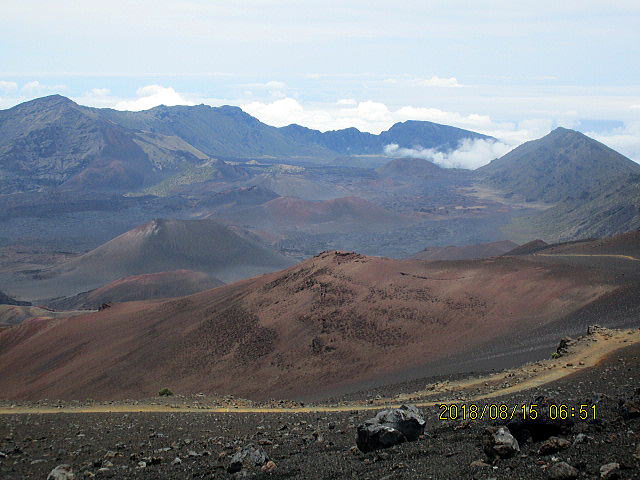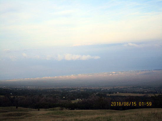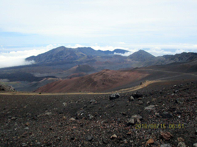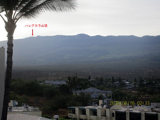 | 今回はナビの聞き落とし、見落としで20分ロス駐車地点到着5時半で、5時半発予定が6時となりました。標高1300m。 | 右上がハレアカラ山山頂方面です。 |