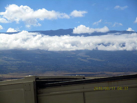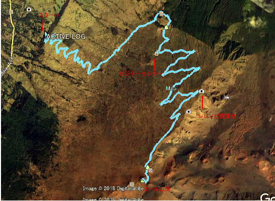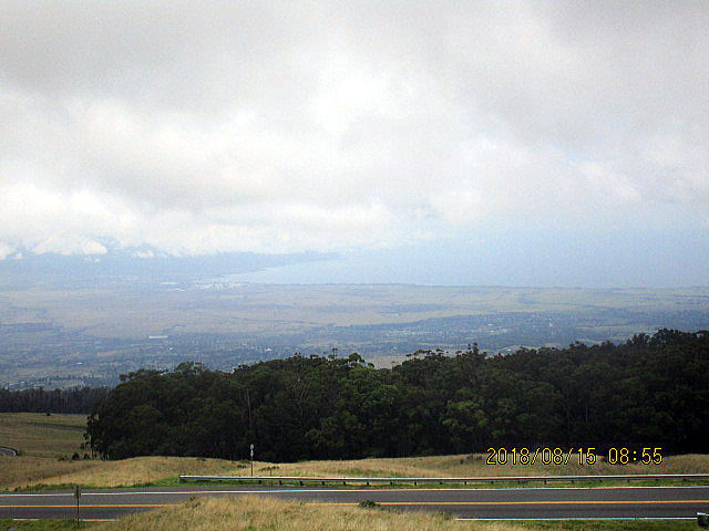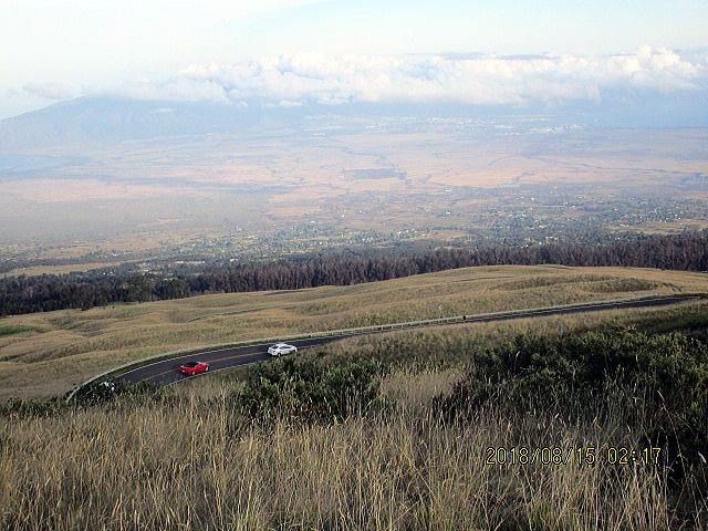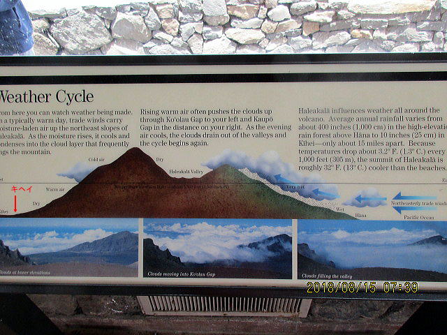 | 標高3055m山頂到着。山頂ビジターセンターが右下にに見えています。 | キヘイ、ワイレアがリゾート地であるのは貿易風によってハレアカラ山によるフェーン現象によって常に暖かい、乾燥していて雨が少ないからだそうです。昼間30~31度、夜も室内29~30度くらいです。もちろん昼夜エアコンは不要です。風だけで十分です。 |