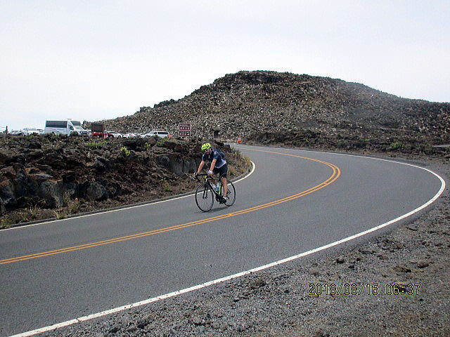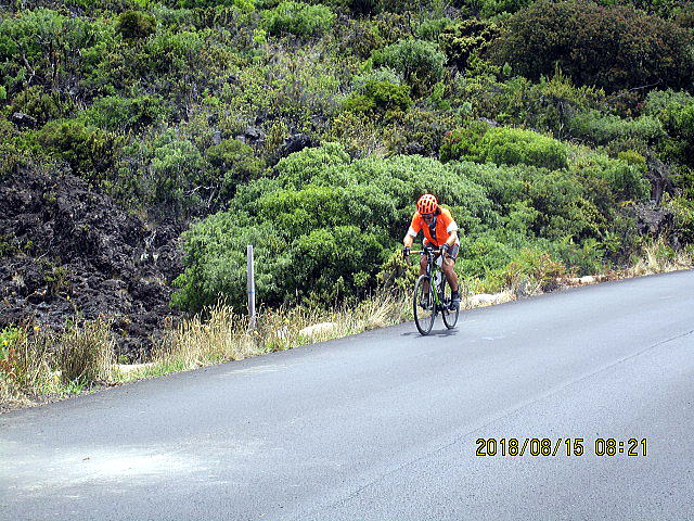 | アヒヒビーチが10時半以降雲に覆われるのがこのチャートが物語っています。13時に山頂を出発しました。 | この日11人目の自転車野郎です。彼は大音量で音楽を鳴らしながら、登ってくるところです。 |