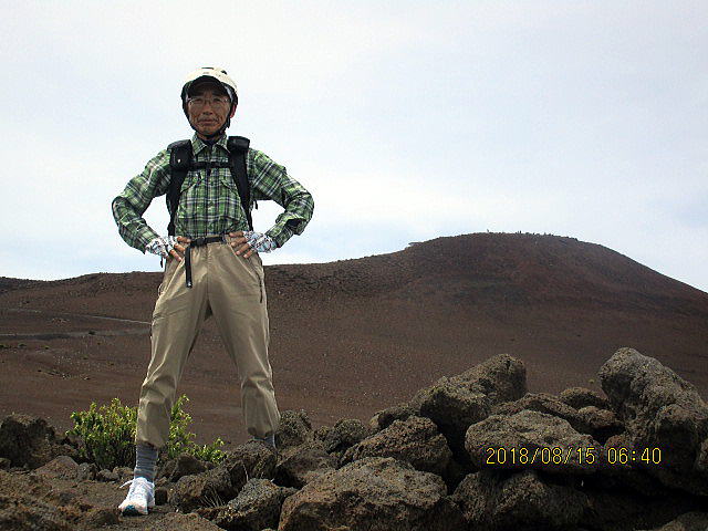 | 私がバイク一番のりでしたが、抜いていった彼が早くも下ってきました。左の方にビジターセンターがあります。 | 三脚を忘れたので火山岩の上にカメラを置いてセルフタイマー活躍です。バックは山頂です。 |