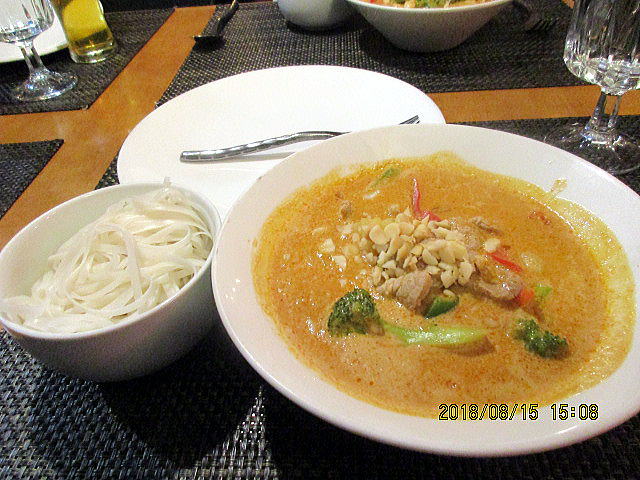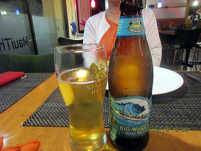 | ビッグウェーブ地元ビールにはまりました。飲みやすい、フレーバーよし。 | マウイ・タイ・ビストロ(レストラン)でマカデミアンナッッツカレー・マイルド・ポークをオーダー左はライスヌードルで平麺でカレーが絡みやすいです。17ドルです。 |