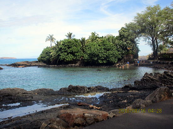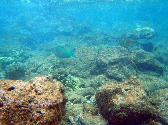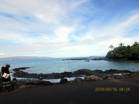 | 最終日となりました。7時頃山頂がコンドから見えます。 | この日も9時半に着き晴れていたのに、10時過ぎから曇ってしましました。アヒヒビーチは砂浜ではありません。砂浜は魚は殆ど見あたらず、波によっ砂が舞い上がるので透明度が低くなりますが、この入り江(コーブ)は風が出るまでは穏やかで透明度も高いです。 |