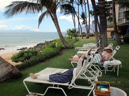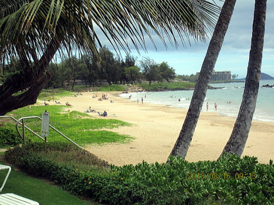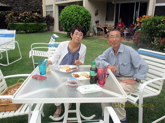 | 朝の9時半の様子。波も少なく穏やかです。これが10時半になると風と雲が出て波がつよくなり、濁ってきます。 | 今日のランチはコンド前の芝生で食べました。 |