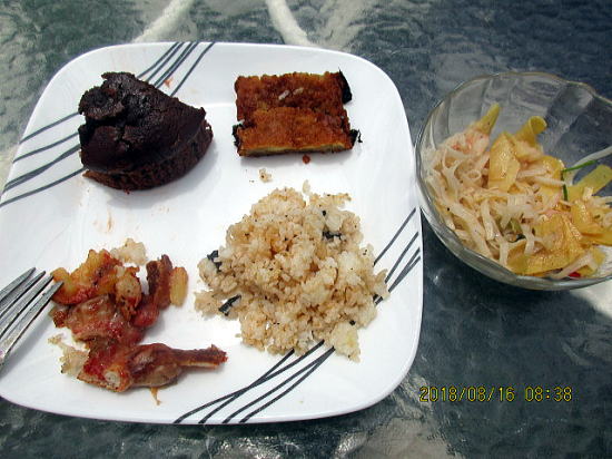 | 右鉢:ケイジャンパスタとライスヌードルミックス炒め、大皿右上:昨日のチキンむすびのカラ揚げチキン、左上:チョコケーキの残り、右下:ロコモコご飯とむすびのご飯のチャーハン、左下:ピザとフライドポテト、パンケーキのカレー炒めのランチです。 | 海が見えると何かしら、ゴージャスな気分です。 |