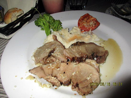 | シェアで5ドル追加でサラダ2人分きます。 | メインのハニー・マカデミアンナッッツ・ローストポークは半分でこんなにあります。19.95ドルです。 |