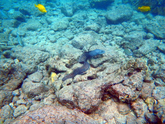 | 魚⑭フグもいました。 | キャア-、ウツボです。へびのように海底をはいながら泳ぎます。 |