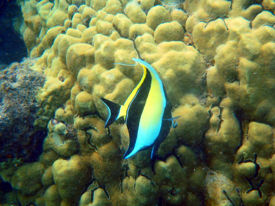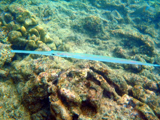 | 魚⑬、最終日もアヒヒベイに向かいます。サヨリのような細い魚優雅に泳ぎます。 | 陽が差すと海中は青く透明感が増します。 |