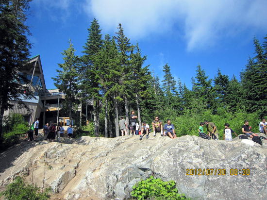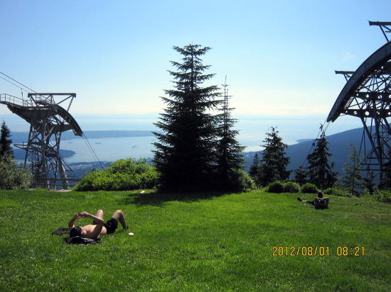 | 駆け上がった猛者は芝でゆっくり休養しています。 | 途中で追い抜いたカナダ人ファミリー、おまえはクール(年齢のわりには登るのが速い)と感心してくれ、話が盛り上がった。息子はバンクーバーで大学生、家はここから車で3時間のところにあるそうだ。こちらに来たので家族登山をしたそうだ。私とほぼ同じ年齢の夫妻だ。 |