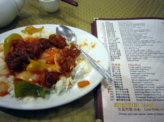 | 21:30 帰宅が遅くなったのでチャイニーズレストランでサワーポーク(酢豚)を注文。1000円程度でした。中国語メニューと英語メニューを見て料理を想像するのも楽しいものです。 | |