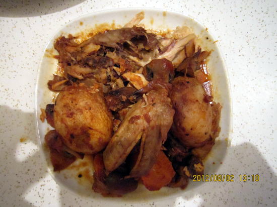 | 7月31日のホームステイの夕食です。チキンとジャガイモのデミグラス+トマトソースのような味付けです。ワンプレートの食事が気にならなくなりました。ホストファミリーはメキシコ出身です。 | 8月1日の夕食です。ペンネのカルボナーラです。あっさりしたクリーム味でおいしくてこれ一品で満足です。 |