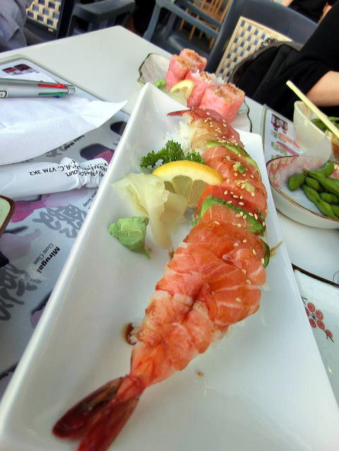 | 私は学校最終日なので今週からはじめた日本と台湾の学生でローンズ・クエイの寿司レストランでディナーをしました。夕日と海に囲まれ盛り上がります。 | これは私のオーダーしたレインボーロールです。エビ、サーモン、ツナ、貝、アボガドがのっています。たしか10ドル程度です。 |