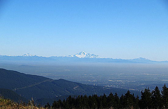 | 東北のアメリカ方面にはMt.Bakerが夏でも冠雪しているのがみえる。(AKIさんから引用) | セカンドバンフピークから正面に山頂(1455m)(写真はVancouver Trailより) |