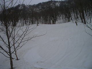 林道交差上部は880mから上部は右岸尾根に取り付きブナと写真のようなゲレンデに感激。このコースが素晴らしい所以である。おまけに雪は締まり沈まない。ただし上部は31日に数センチの降雪があった模様で、フイルムクラストになっていたため時々スリップする。