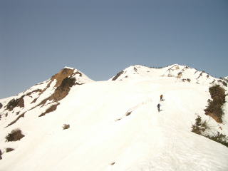 見事な赤頭山、かしらが赤いから命名されたのであろう。ルンゼをのぞきましたがこの時期なら締まって十分すべられます。