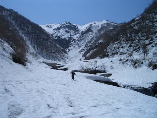 満ち足りた気分で右岸を直滑降。ふり返ると滑降ラインが見える。来年また来させておくれ。素晴らしき白谷よ。