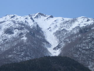 どうです、かっこいいいでしょう。これが当初の計画の赤頭山です。さくら街道R156から見える一直線に伸びている正面ルンゼは滑ってみたくなります。写真手前の植林帯を通過後、右の尾根を登る予定であった。めっこの会のMさんが3度も挑戦した気持ちが分かる。しかし標高630mの野谷橋と林道、山の南斜面には雪は皆無で、760m地点の白谷へ変更する。