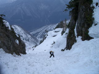 シッタカ谷は小雪崩は起きず快適、デブリ地帯は、ちょうど筋肉休息地点、通過した後はきれいな斜面が待っているので力一杯飛ばすことができる。う〜ん、ファンタスティック。